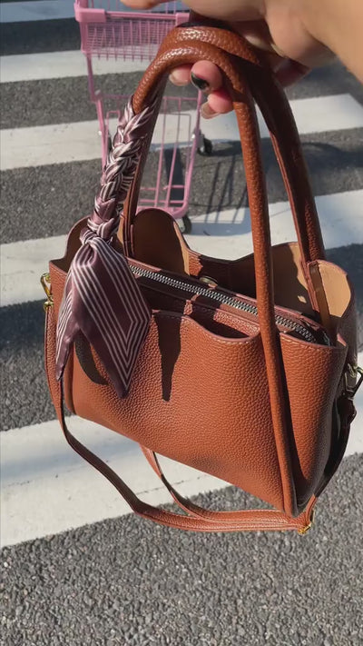 I love how chic this bag looks! The brown shade is so versatile and the scarf detail makes it stand out.